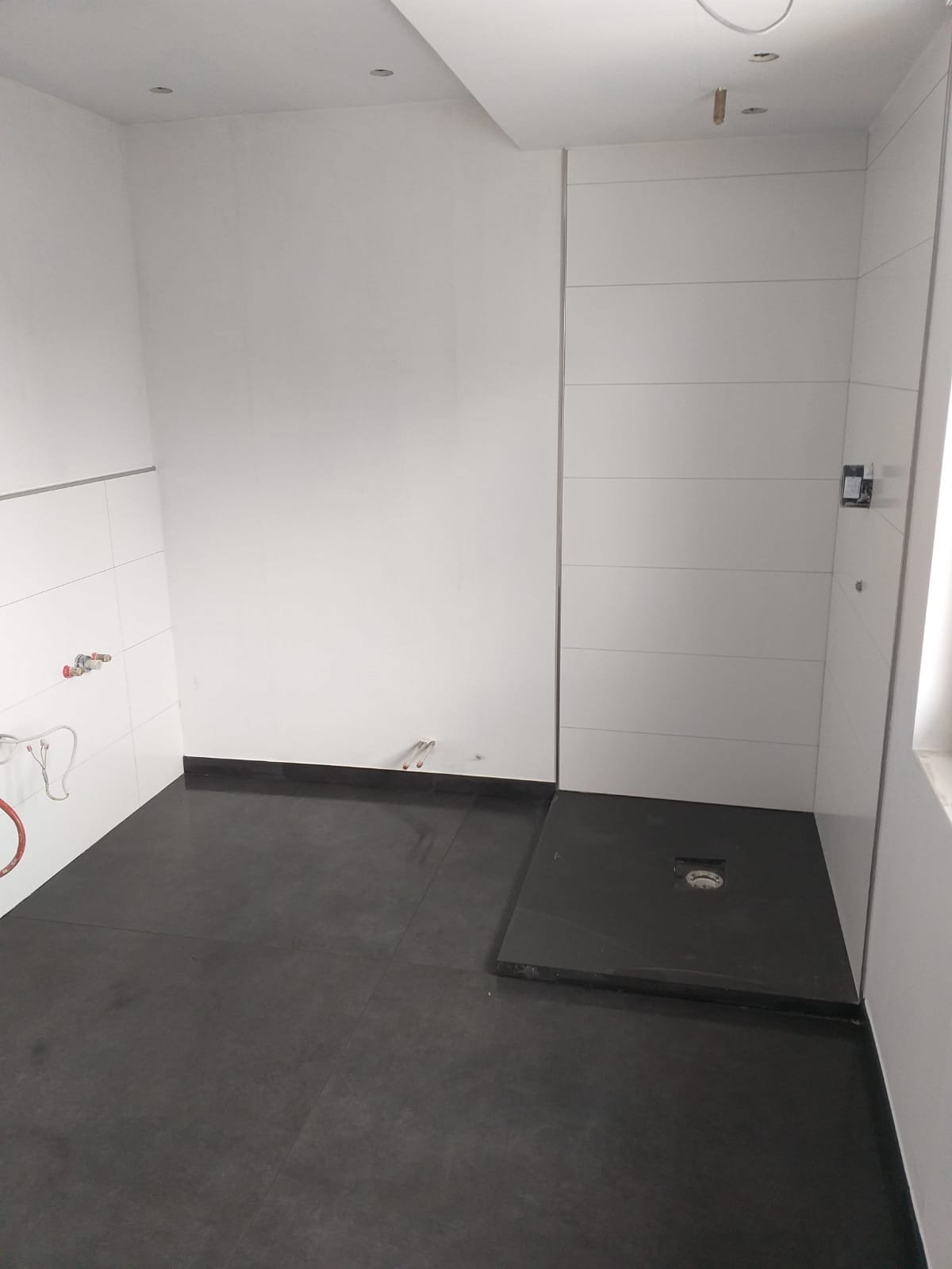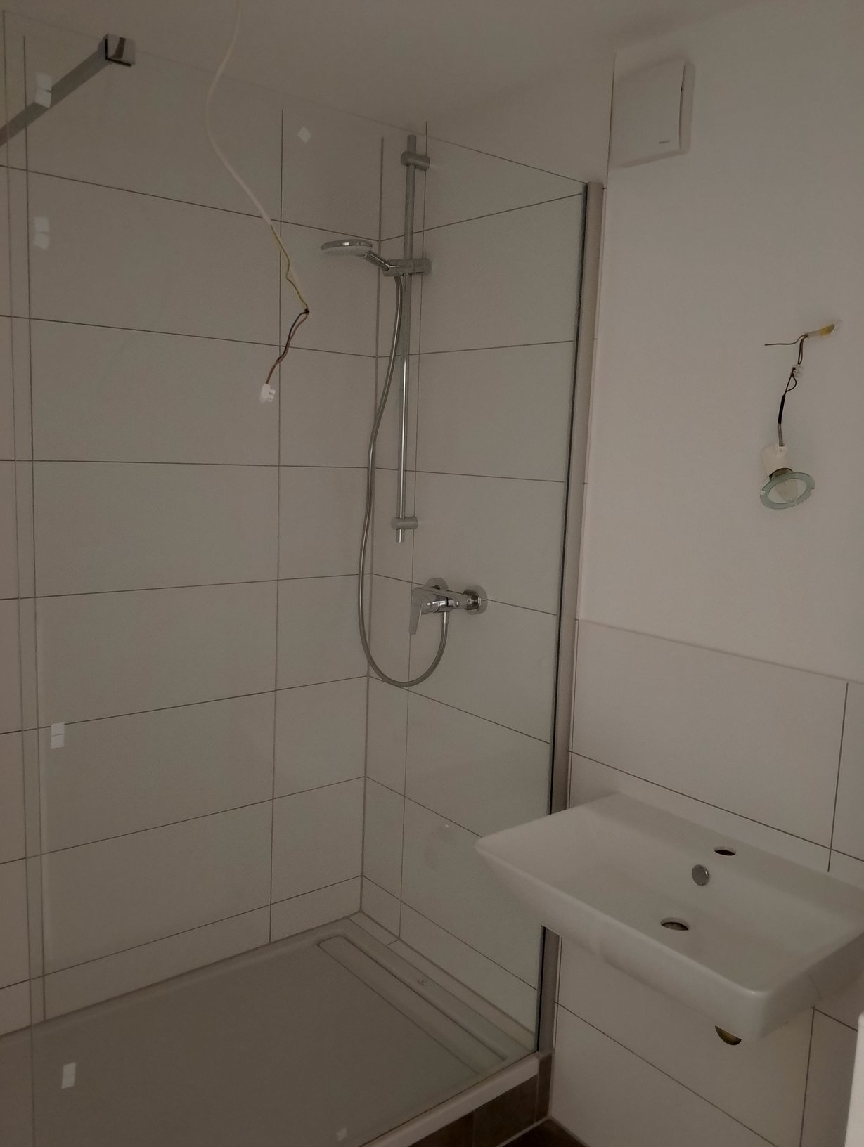Bei diesem Großprojekt wurde eine 250 m² große Tanzschule in sechs Studenten-Apartments umgewandelt. Die besondere Herausforderung: Die fachgerechte Fliesenverlegung auf altem Holzparkett. Mithilfe eines speziellen PCI-Produktsystems realisierten wir eine sichere Abdichtung und verlegten den modernen Klassiker: großformatige Bodenfliesen in Anthrazit (60×60) kombiniert mit zeitlosen weißen Wandfliesen (30×60). Ein funktionales und ästhetisches Ergebnis auf ca. 6 m² pro Badezimmer.