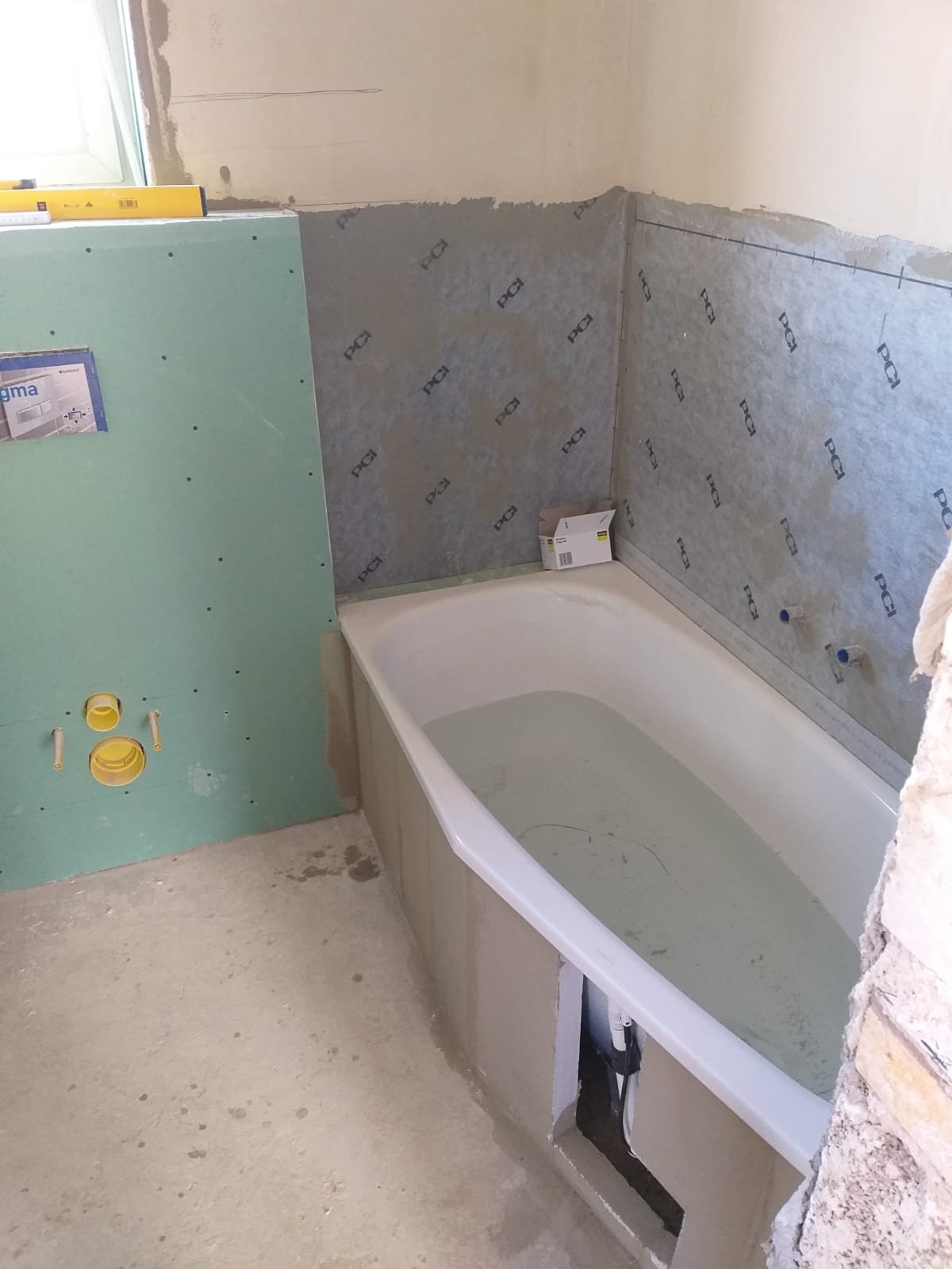Kompletter Rückbau des alten Estrichs und Begradigung des Untergrunds mit Ausgleichsmasse. Einbau einer sanierungsoptimierten Fußbodenheizung (Nordic Fos) im Bestand. Als Oberbelag wurde Naturstein (Travertin) im römischen Verband verlegt. Zur Vermeidung von Steinverfärbungen kam ausschließlich spezialisierte Naturstein-Bauchemie zum Einsatz. Die fachgerechte Anbindung der Heizung erfolgte durch einen Partnerbetrieb.